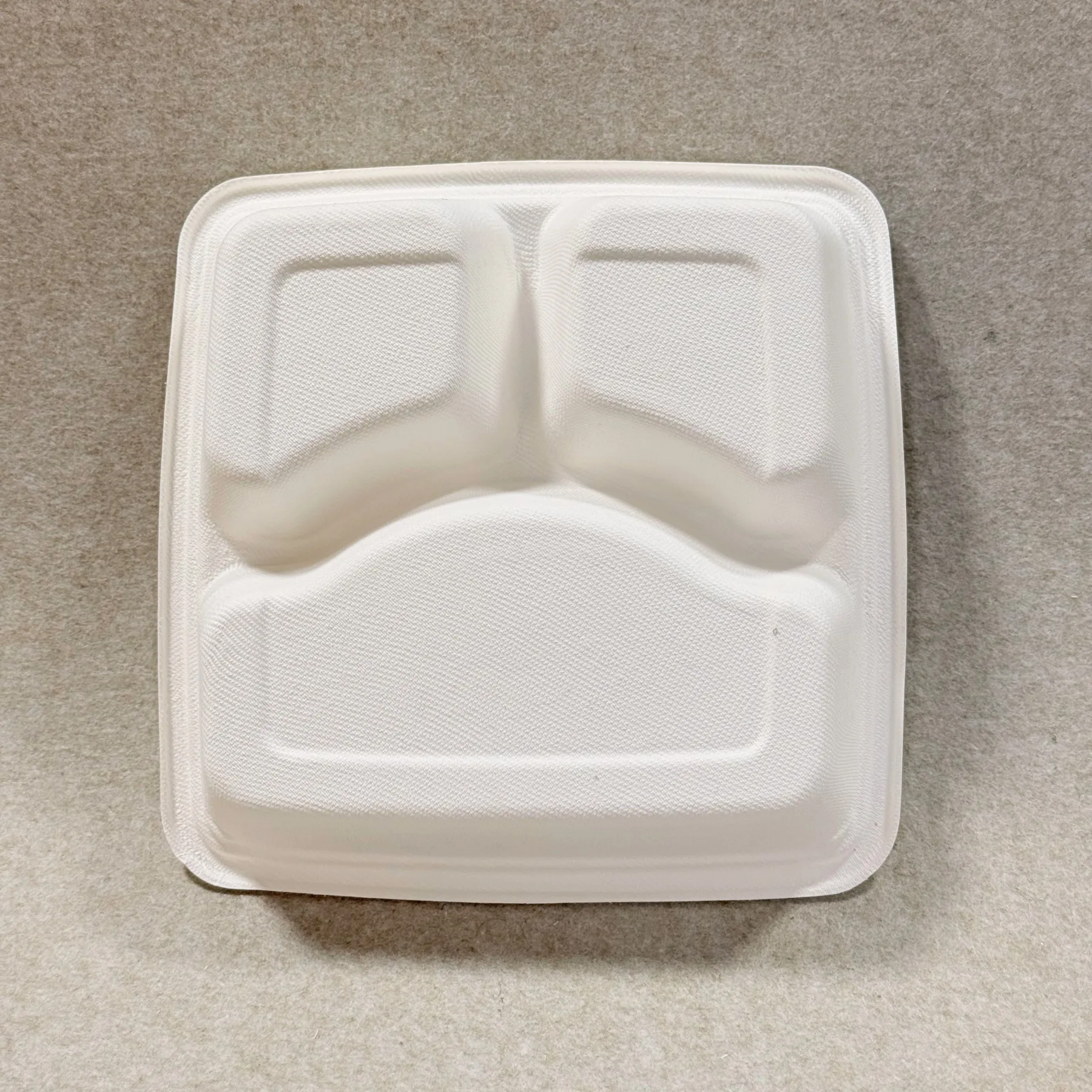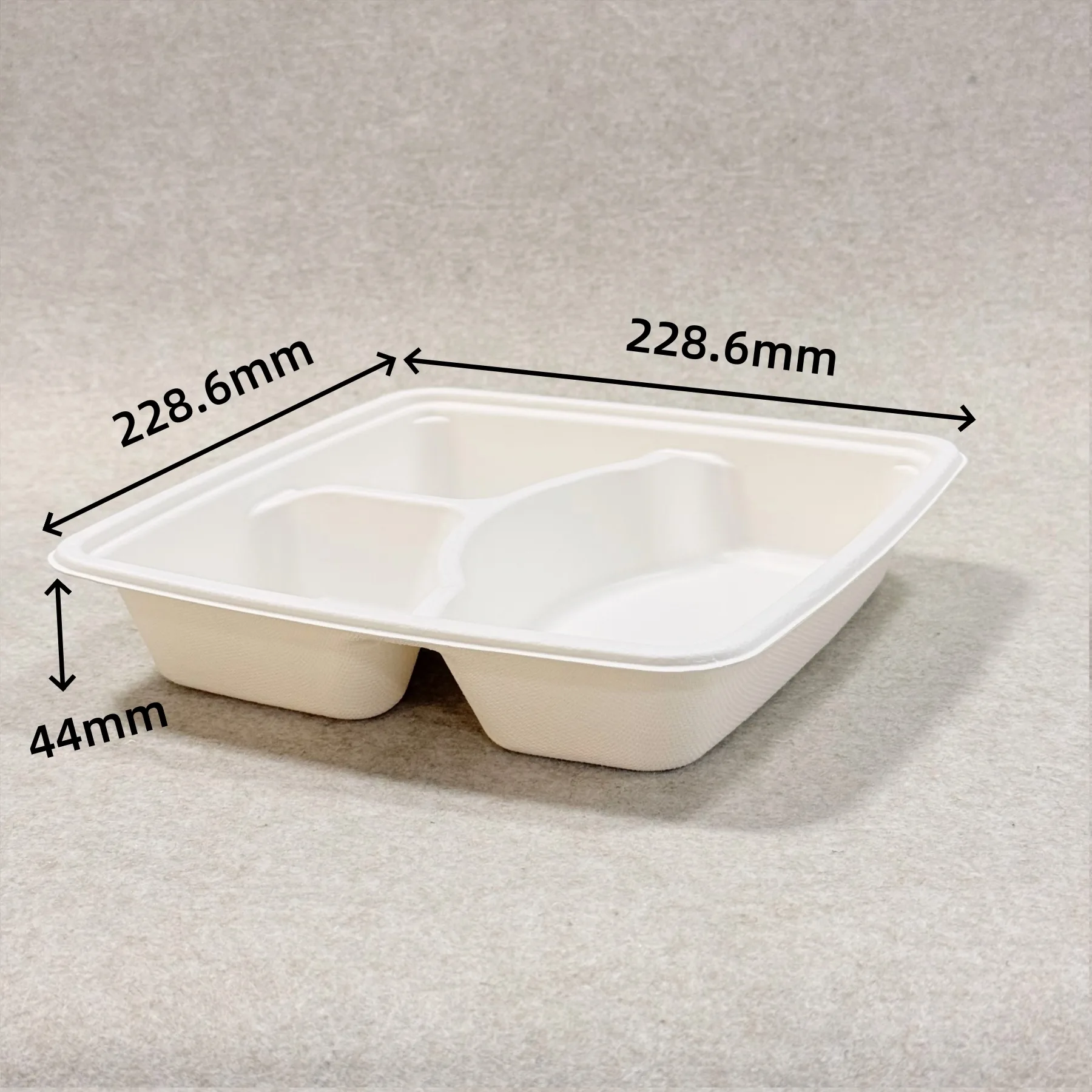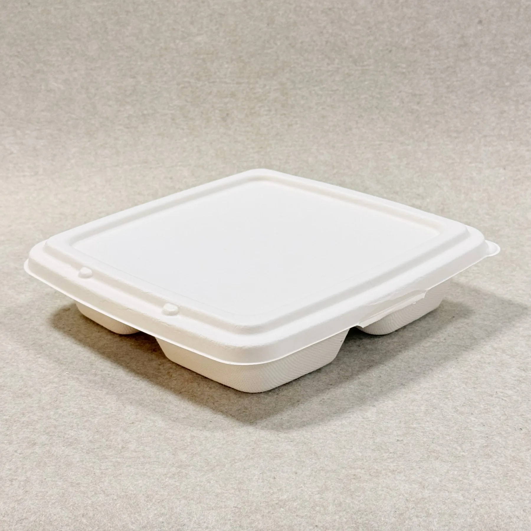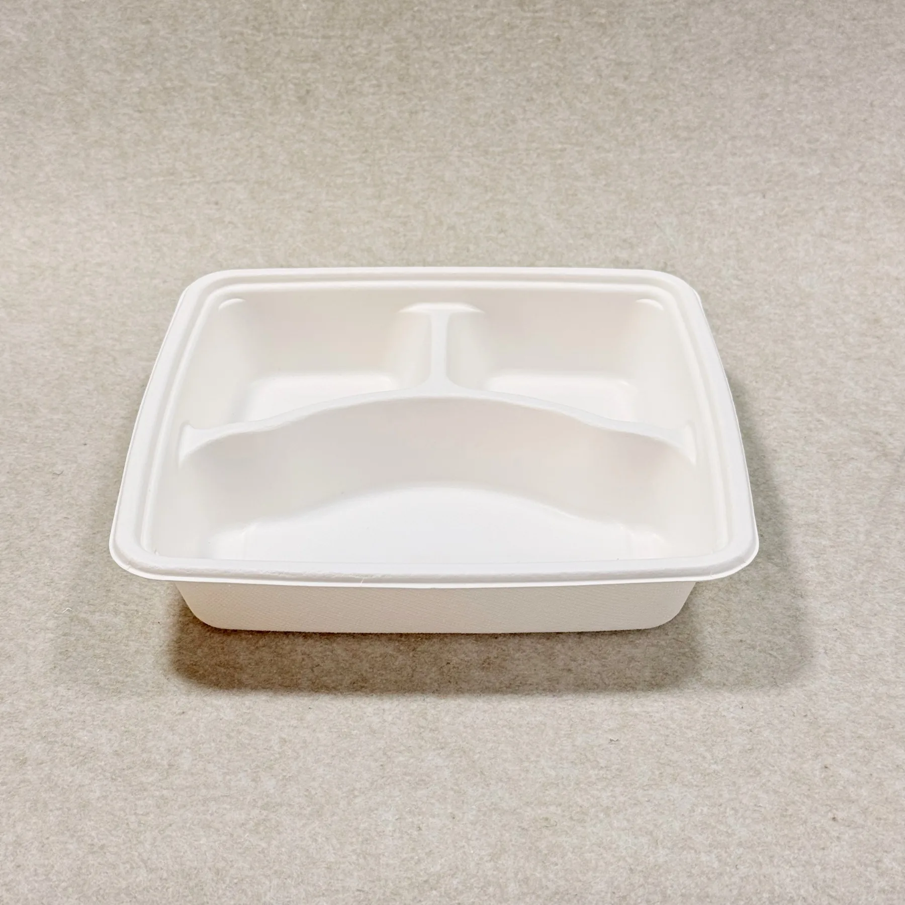 At Bioleader®, molded bagasse products are produced for practical foodservice use, not only for environmental positioning. The pulp is cleaned, refined, pressed into shape, and heat-formed to create a rigid bento-style meal box with three compartments and a matching lid. This process gives the product dependable structure, stable portion separation, and resistance to normal oil and moisture exposure in takeaway applications.