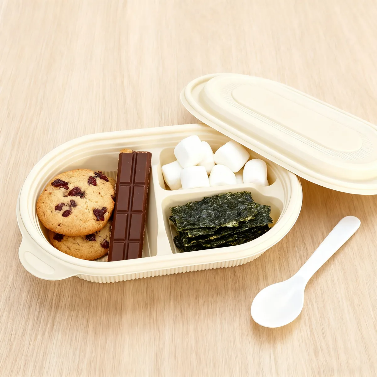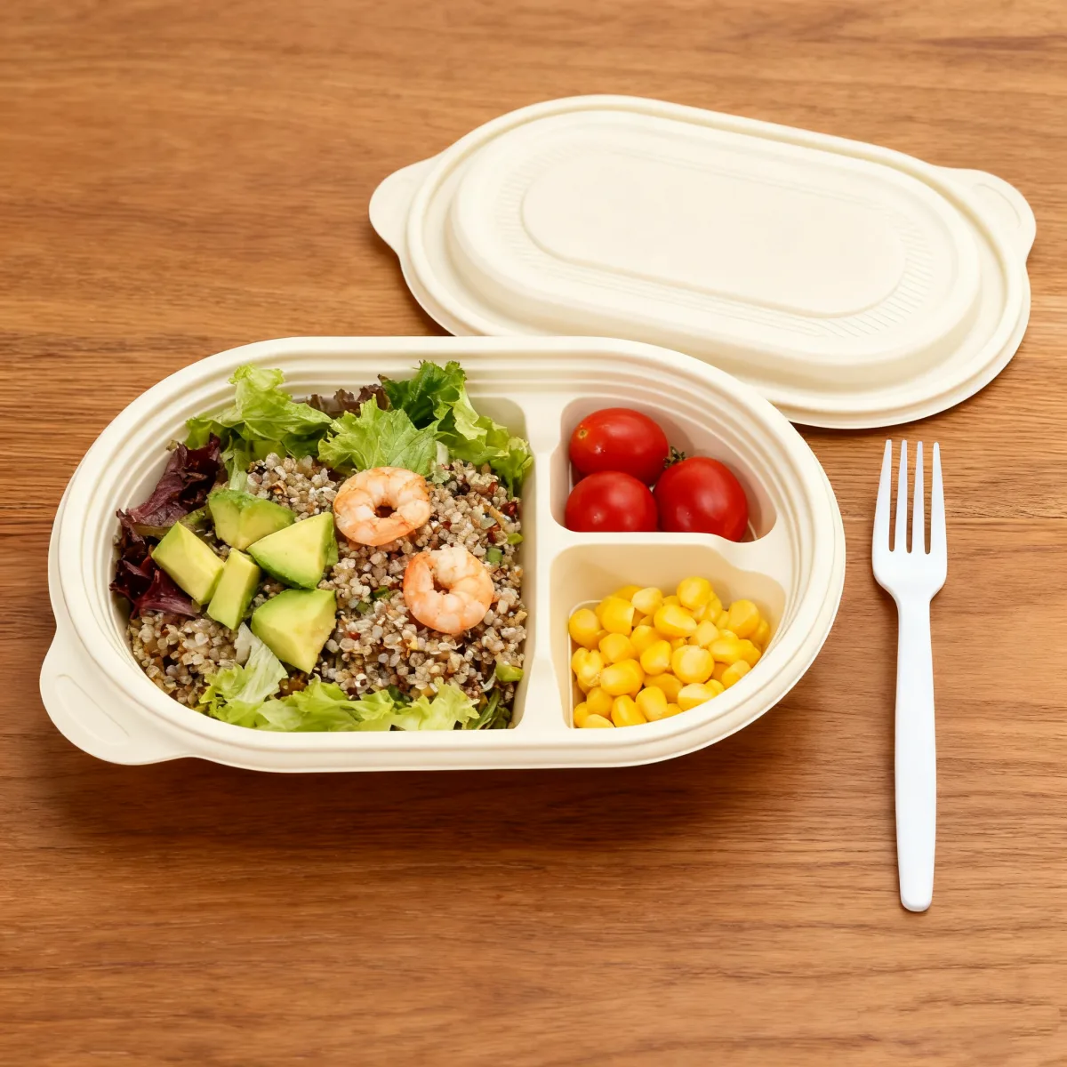 The Cornstarch Food Container Tray With Lid 650ml 3-Compt. is a versatile Compostable Bento Box designed to keep meals neatly separated. Made from renewable corn starch, it’s heat-resistant, grease-proof, and safe for both hot and cold foods. This product is an excellent solution for restaurants and food brands seeking Biodegradable Take Out Containers, Eco Friendly Togo Containers, and certified eco packaging options.