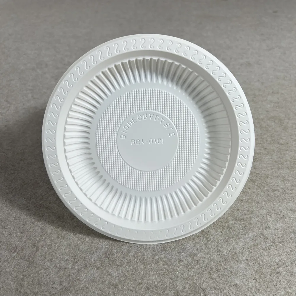 Os pratos compostáveis da Bioleader são moldados a partir de bioplástico de amido de milho à base de plantas certificado para compostagem industrial. Estes pratos redondos resistem ao calor, à gordura e às fugas, suportando o aquecimento por micro-ondas e mantendo a integridade estrutural para pratos quentes ou frios.