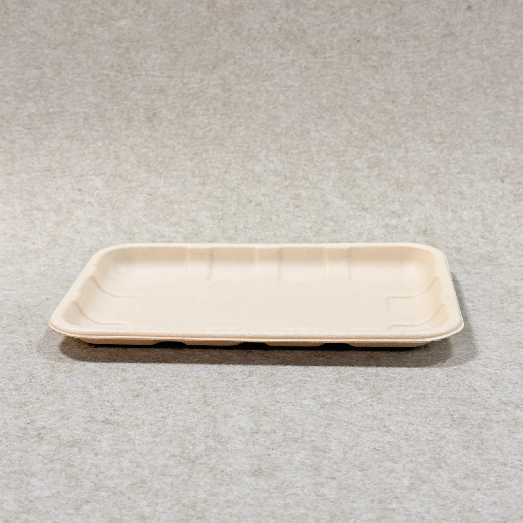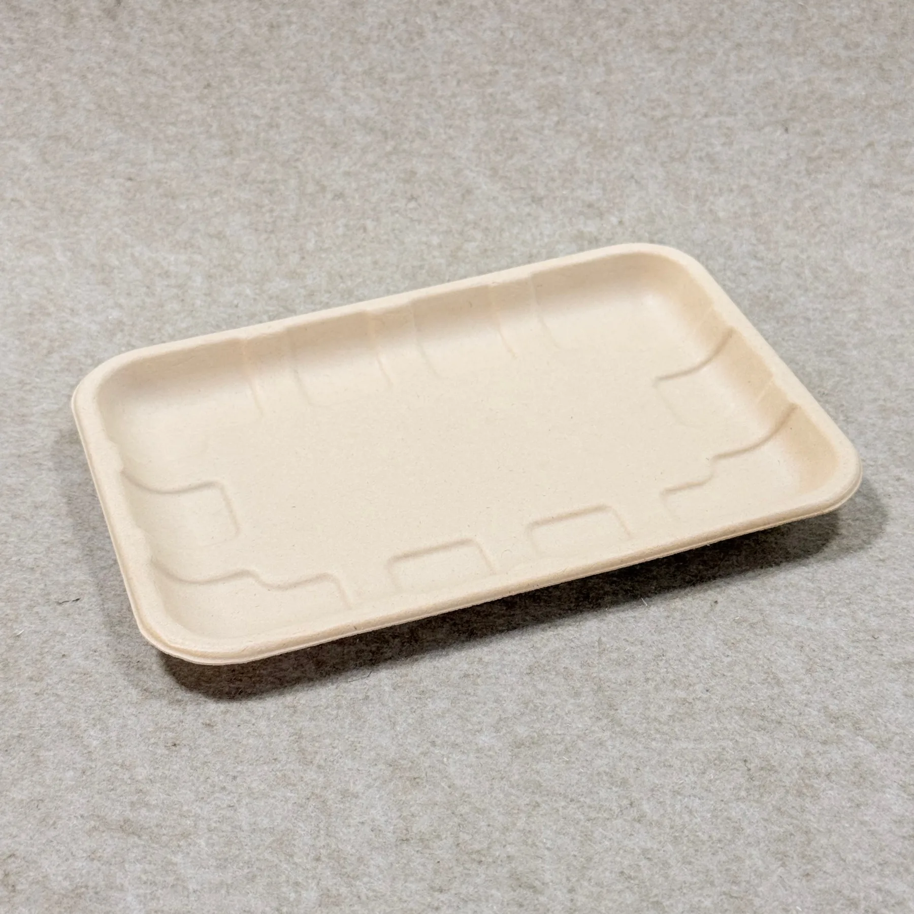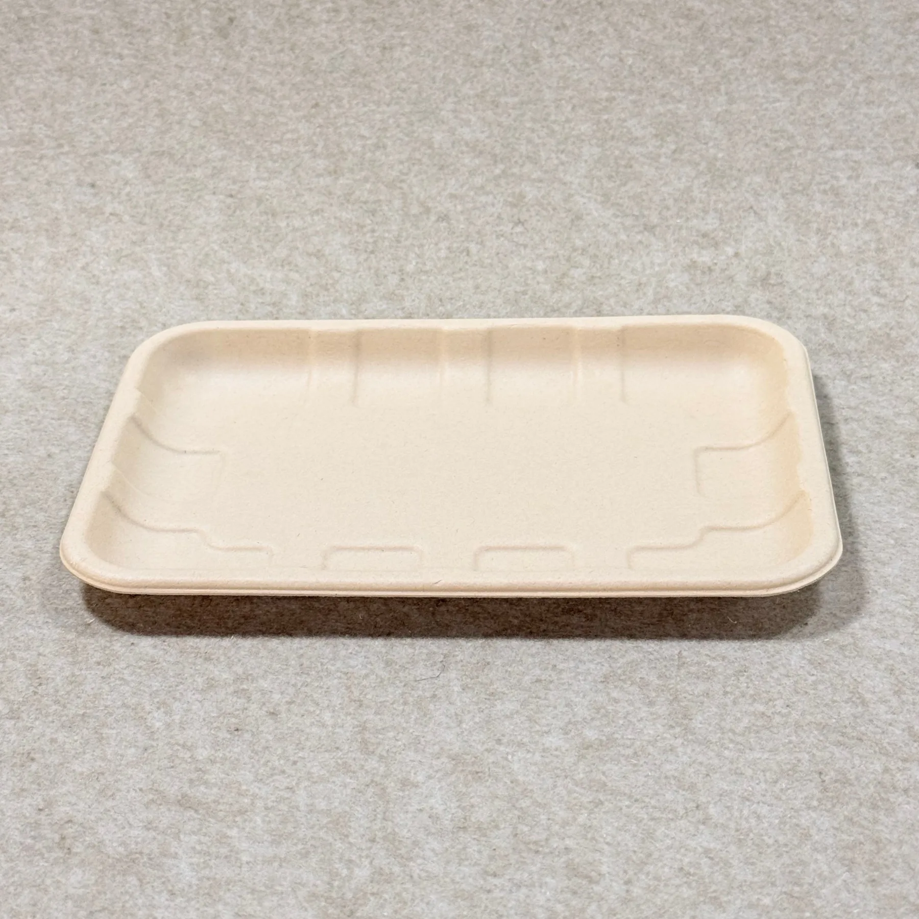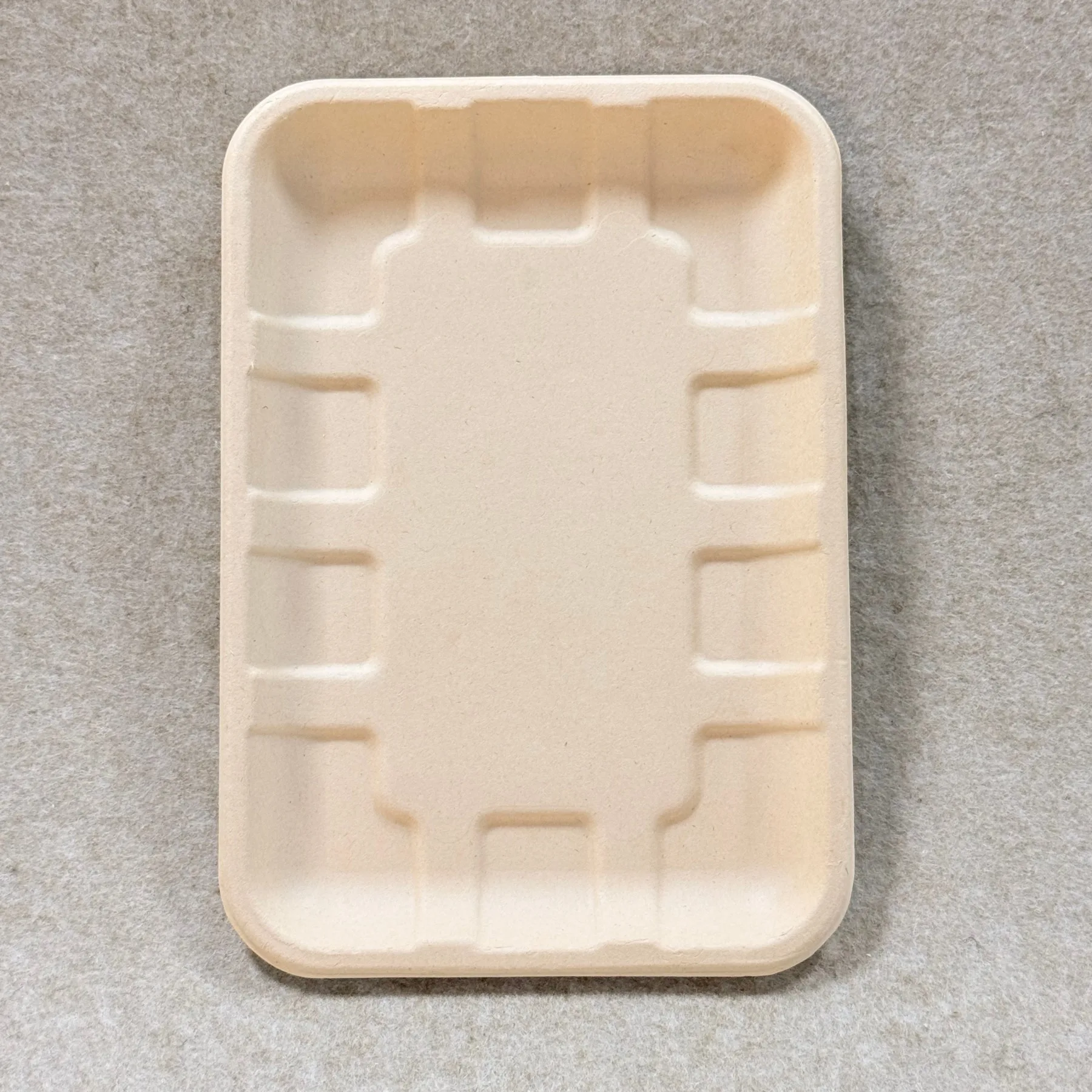 Este método de fabrico cria um tabuleiro que é leve mas rígido, empilhável e adequado para a utilização diária no retalho e na embalagem de produtos. A superfície acabada tem uma textura mate limpa que suporta uma apresentação natural, premium e ecológica para fruta, legumes e produtos alimentares frescos.