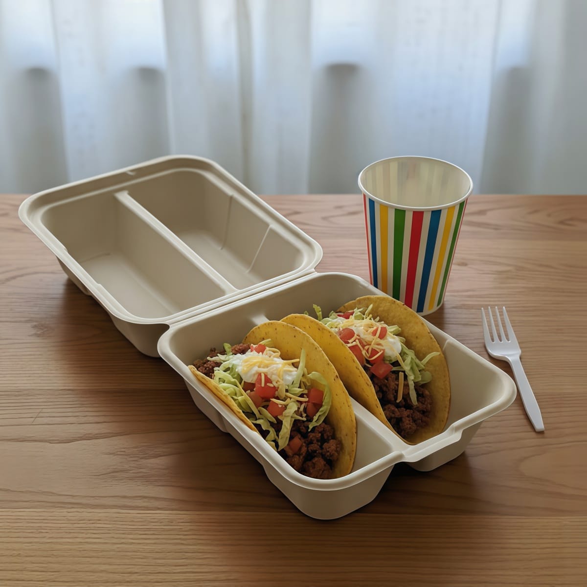 Bioleader®'s Коробка Taco Bell с 2 отделениями, изготовленный из жмых сахарного тростникаОна полностью компостируема, герметична и идеально подходит для тако, комбинированных блюд и упаковки на вынос. Она безопасна для микроволновой печи, устойчива к жиру и готова к экспорту, имеет сертификаты FDA/LFGB, EN13432 и ASTM D6400. В качестве Китайский завод и оптовый производительBioleader® обеспечивает OEM/ODM и глобальные оптовые поставки.